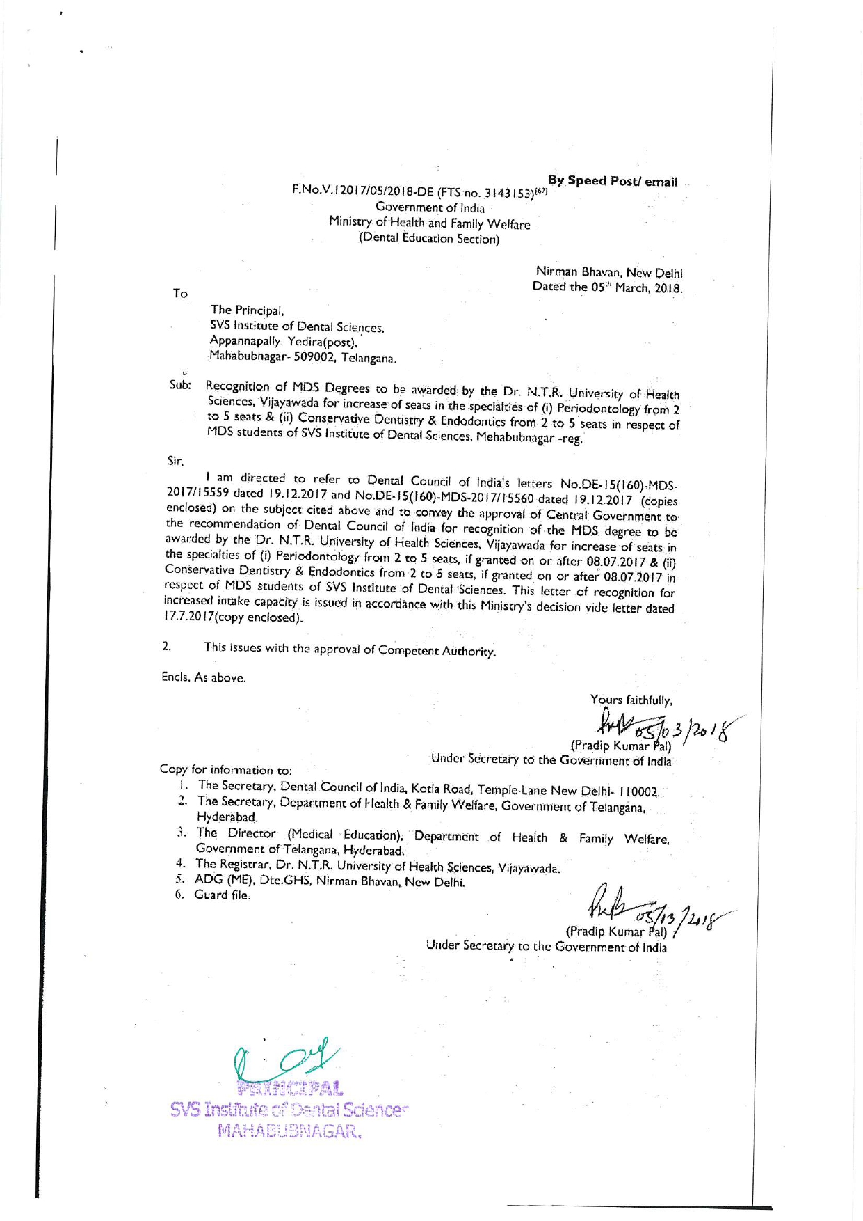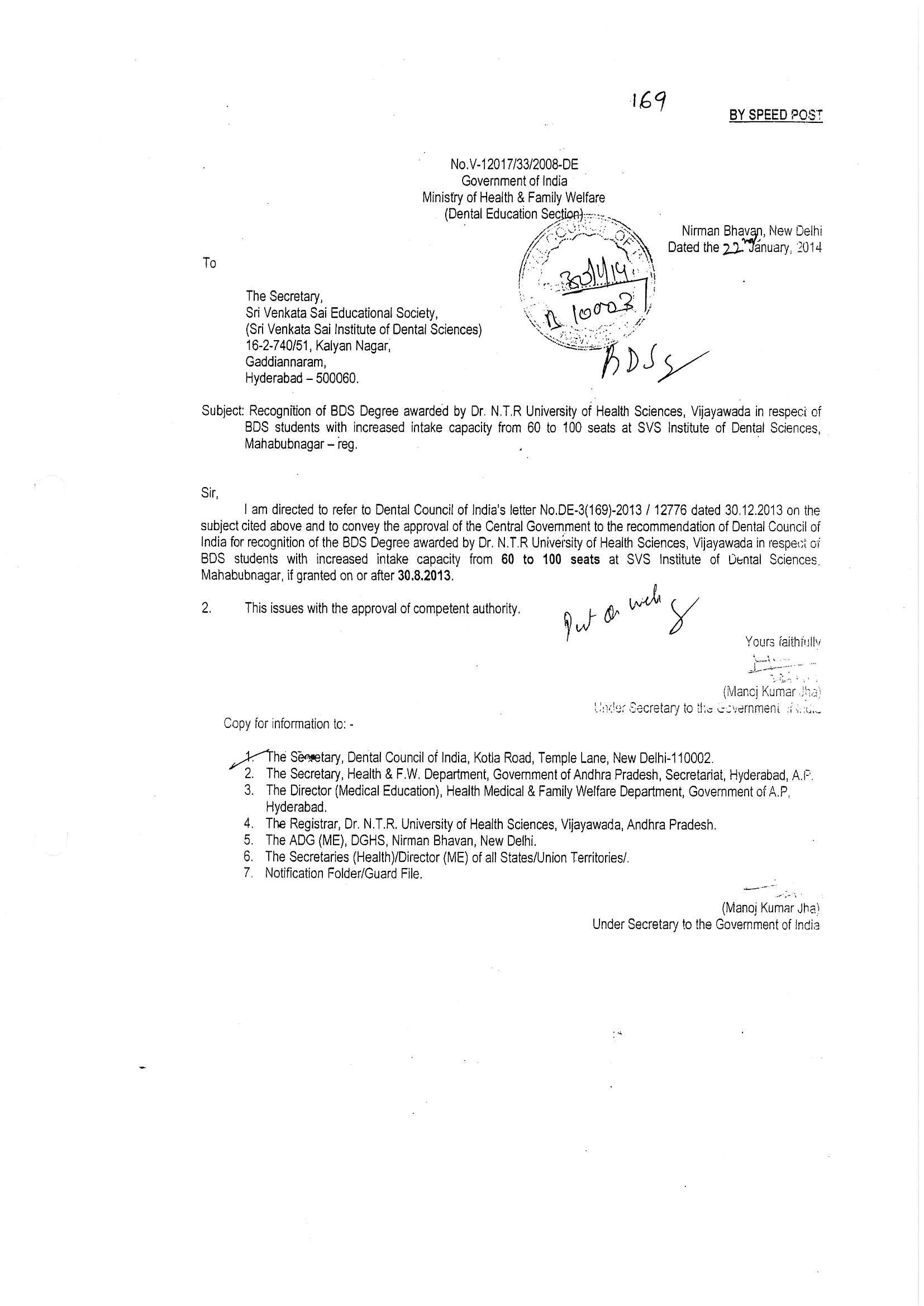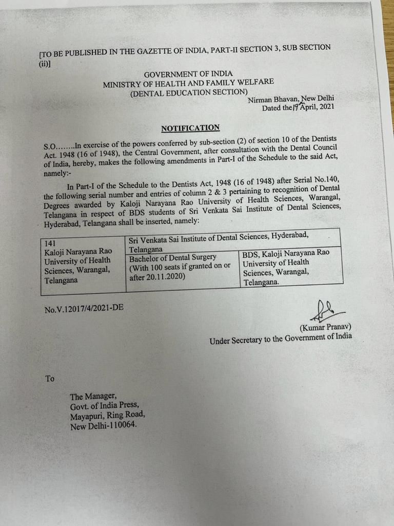 Sri Venkata Sai Educational Society – Registration Essentiality Certificate Recognition of BDS Recognition of BDS degree under KNRUHS Recognition of MDS – PERIO & CONSE & ENDO Recognition of MDS – ORAL PATHOLOGY Affiliation of MDS – 2021 Recognition of MDS – ORTHO, OMR, PROSTHO, PEDO & OMFS